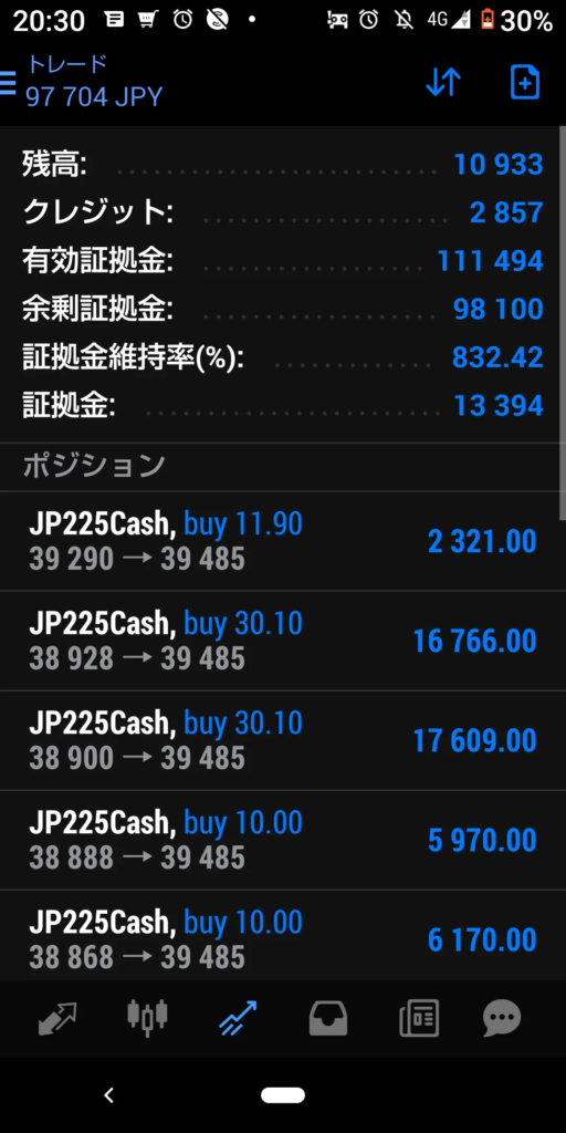 ポジションを一つ維持率を下回り切られましたが、現在含み益97704円です。