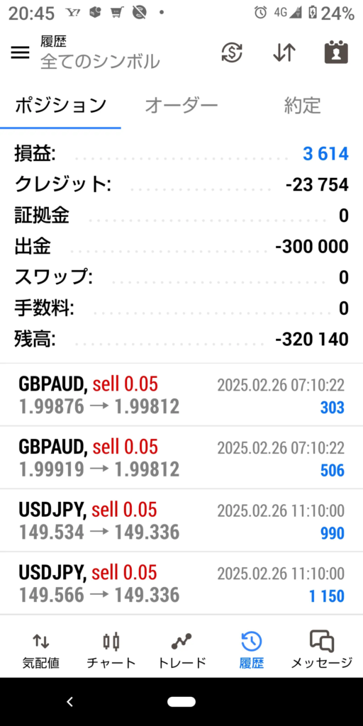 2025年2月26日のトレード結果 プラス 3614円