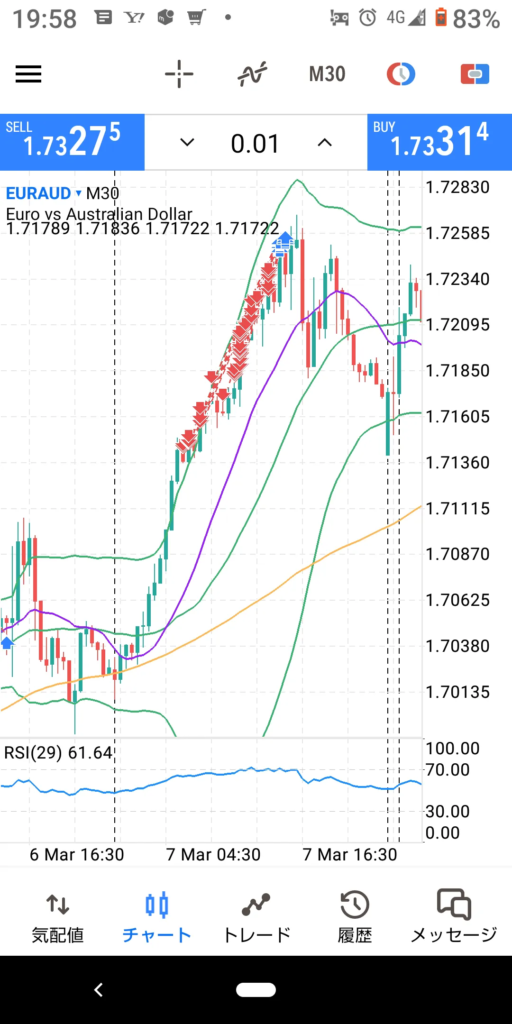 今日は本当に危なかったです。EUR/AUDを逆張りでショートしたのですが予想よりも800ポイントも上がり結局80万円以上でやっと損切りしてもう一つの口座に83万円があったのでそちらで再度ショートし何とかプラテンした次第です。
